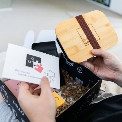 - Power Box: Die gesunde Portion Energie für neue Mitarbeiter, gefüllt mit einer Bambus-Lunchbox, einem Thermo-to-go Becher und einem kräftigen Vitaminshot. Jede Onboarding Box wird mit einem individuellen Motto und Unternehmenslogo personalisiert, was sie nicht nur zu einem nützlichen, sondern auch zu einem emotional wertvollen Geschenk macht. Entdecke die volle Palette unserer Onboarding Boxen!