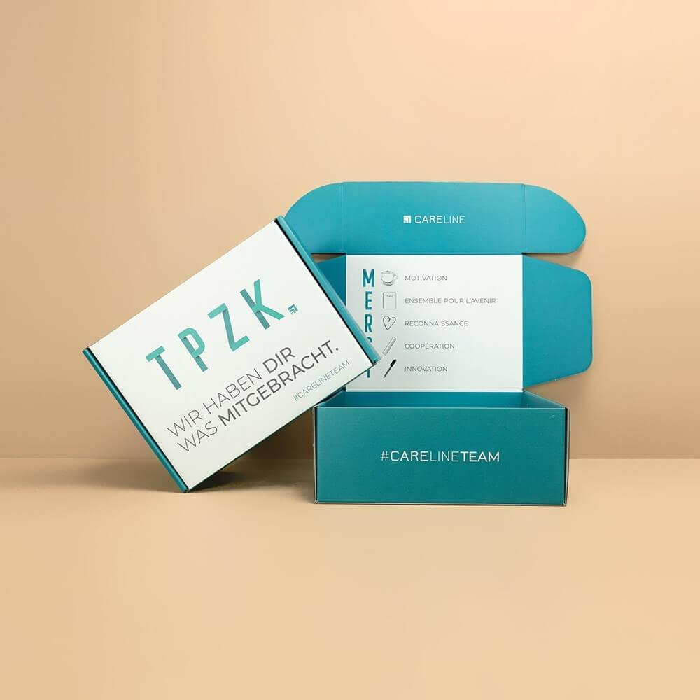 Marketing: Unsere Versandkartons sind vollständig bedruckbar und personalisierbar. Das bietet dir Gelegenheit, dich bei deinen Kunden etwa mit einer Grußformel oder einem individuellen Gutschein-Code zu bedanken – zum Beispiel an der Innenseite des Deckels. Es sind oft die kleinen Dinge, die Kunden binden.