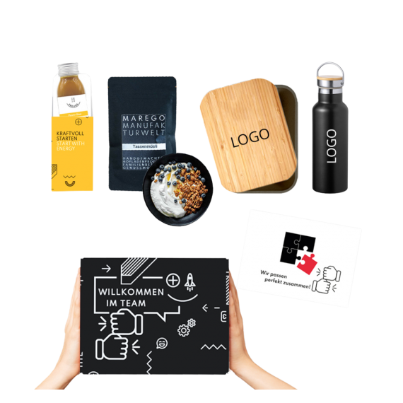 Die Willkommensbox "WORK BOX" ist das ideale Onboarding-Geschenk für den ersten Tag im neuen Büro. Sie enthält eine Glas-Lunchbox mit Bambusdeckel für den täglichen Energiesnack, kombiniert mit einem praktischen Thermo-Trinkbecher, auf dem das Firmenlogo graviert werden kann. Abgerundet wird das Geschenkset durch ein A5-Notizbuch, das viel Platz für kreative und erfolgreiche Ideen bietet.