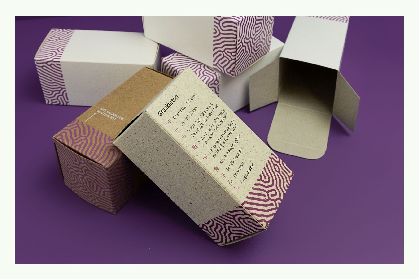 SUSTAINABLE MATERIALS: The materials we use are all recyclable and compostable and come from sustainably managed forests. In addition to pulp, chromo, recycled or natural cardboard, we also offer grass cardboard. Grass grows back very quickly and is therefore a very sustainable and, above all, resource-saving alternative to cellulose fibers from trees. Together with recycled fiber, they are the ideal solution for environmentally friendly product presentation.